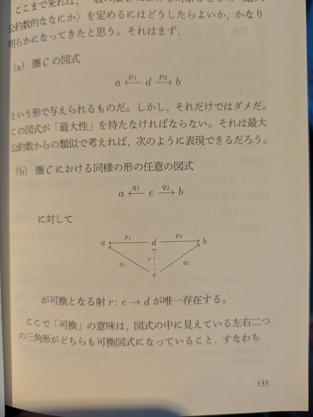 - 頂点と矢印からなる図式を考える、ある頂点からある頂点へ至る複数の経路がすべて互いに等しいときその図式は可換であるといえる