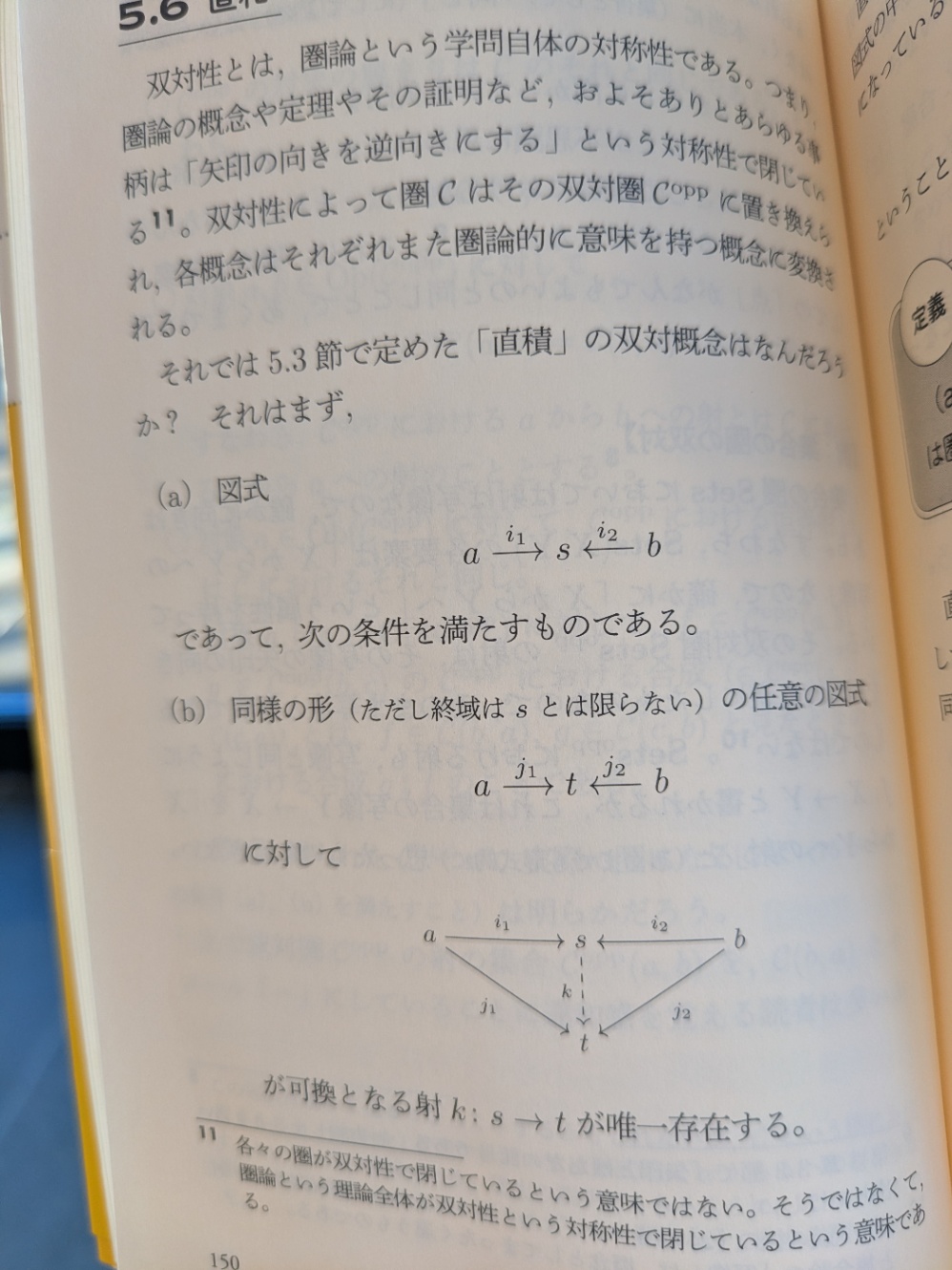 - 双対性は圏論という学問自体に存在する対称性であり、各概念にも適用される、直積の対称性を持つ概念は直和である