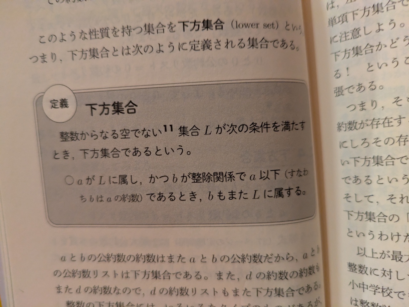 - dの約数という下方集合は単項下方集合であり、そのためaとbの公約数の下方集合も単項下方集合であるといえる、そもそも整数を抽象化した代数的整数の世界ではaとbという2つの整数の公約数が単項な下方集合であるかどうかはわからない=aとbに最大公約数が存在するかはわからない